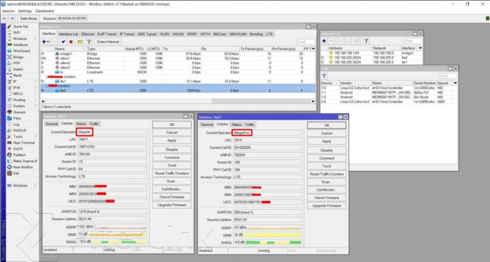 В составе антенны плата роутера MikroTik и два промышленных модема LTE-A Simcom SIM7912G cat.12, NeoWay N75 и cat.4 с функцией резервирования и балансировки каналов.