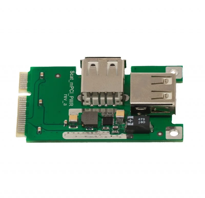 Купить адаптер питания mimiPCI-e to USB. Высокотоковый преобразователь питания 3.3В 3А в 5В 2А. Способен отрабатывать резкие всплески токопотребления, которые случаются при резких процессорных нагрузках и импульсной работе передатчика модема.